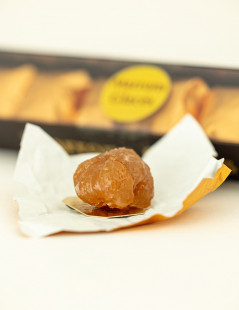 Composition : Marron confit enrobé d’une fine pellicule de glace translucide. Sa texture est tendre et le gout de marron est rehaussé d’une note subtile de vanille en gousse Bourbon de Madagascar.